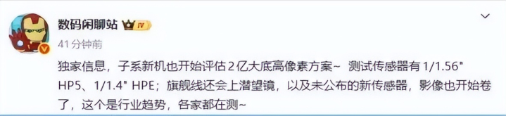 11 月 21 日,圈内出现“子系品牌评估 2 亿像素大底方案”的线索,跟帖猜测多把目标指向 Redmi K100 Pro Max;流出的测试清单里同时出现 1/1.56″ 三星 ISOCELL HP5 与 1/1.4″ HPE,配套潜望长焦与一枚未公开的新传感器,均为爆料场景的信息点。