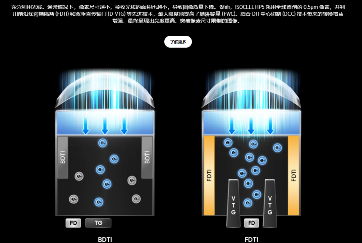 把背景放上:HP5 本体是 200MP 级,0.5µm 像素、FDTI 与 D-VTG 等堆栈,原生高像素+像素合并两条路都能走,做中/长焦的裁切余量更大,这是它与 1/1.4″级别器件搭配时的技术逻辑。