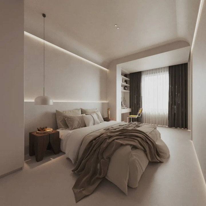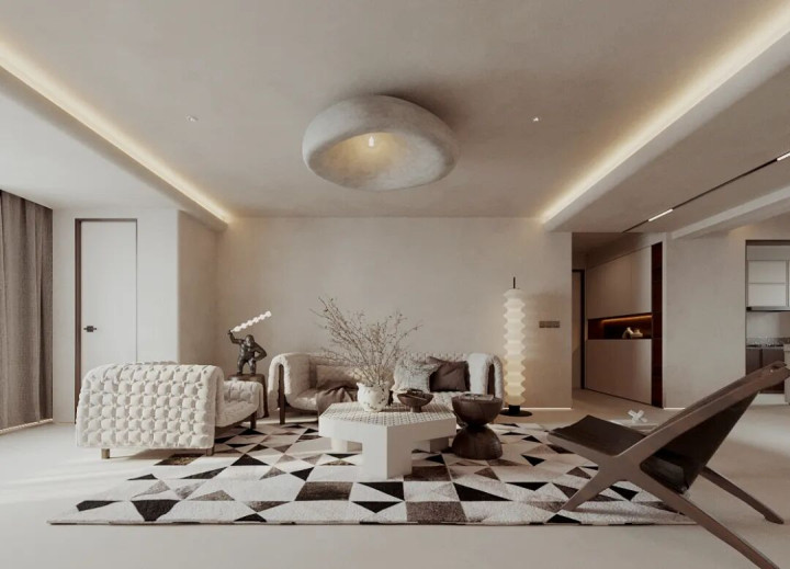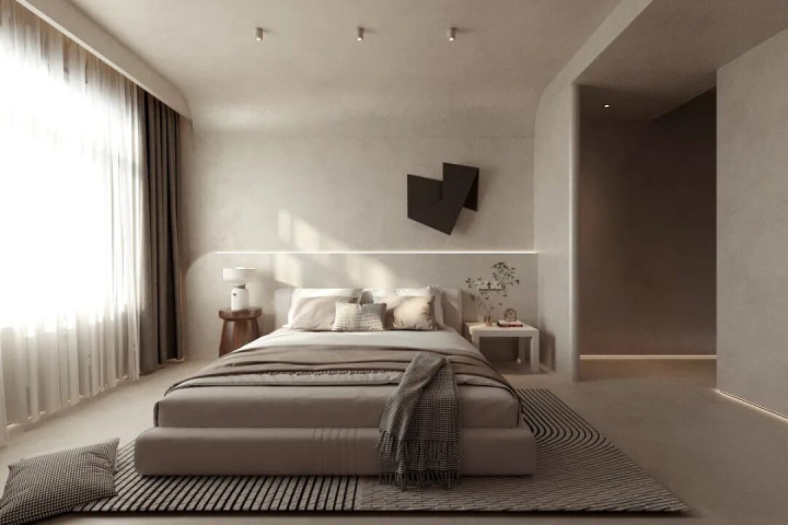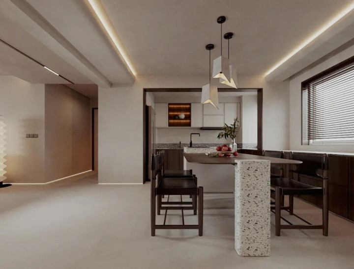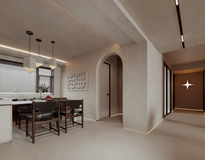 设计要点/ 1、用肌理材质换冷硬饰面:比如肌理漆、柔感木饰面,替代光亮瓷砖/石材,让空间摸得到温柔;2、加柔元素柔化线条:弧形门洞、圆角家具,藏起尖锐感,让侘寂的松弛裹满每处。