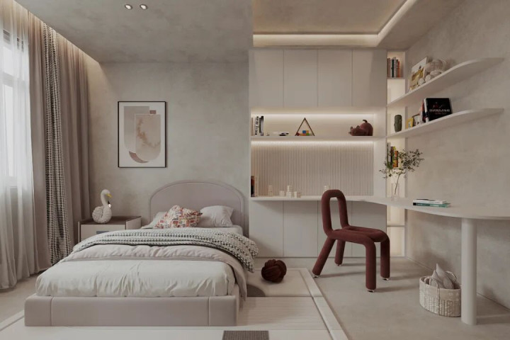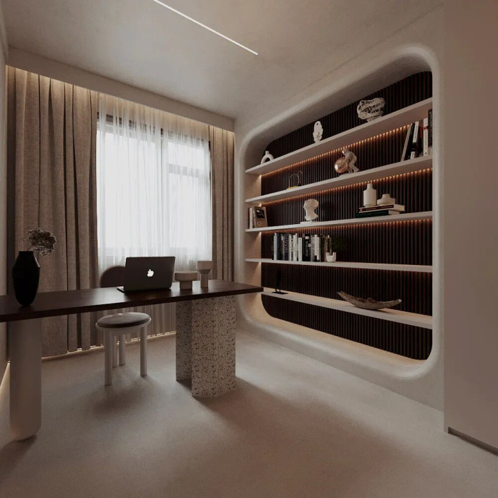 书房:柔弧里的静读📖弧形内嵌书架把线条揉得温柔肌理墙的静谧裹满整间房简约书桌搭自然材质凳连灯光都慢下来在这里读书办公思绪都能沉在侘寂的静里