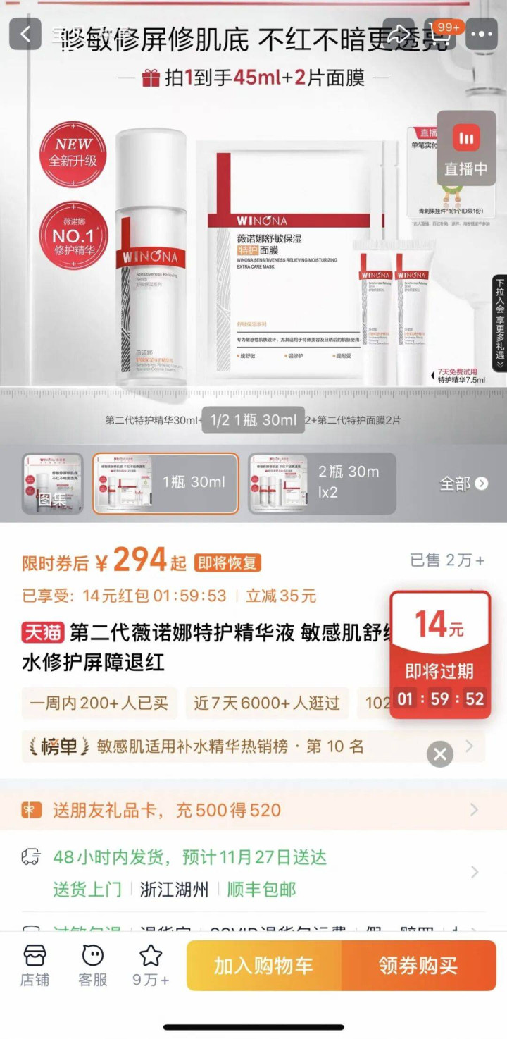 电商平台显示,截至11月24日,薇诺娜特护精华液现价294元/30ml,珀莱雅早C晚A精华组合518元/60ml,而倩碧302光子镭射瓶价格595元/30ml,是前两者的两倍。