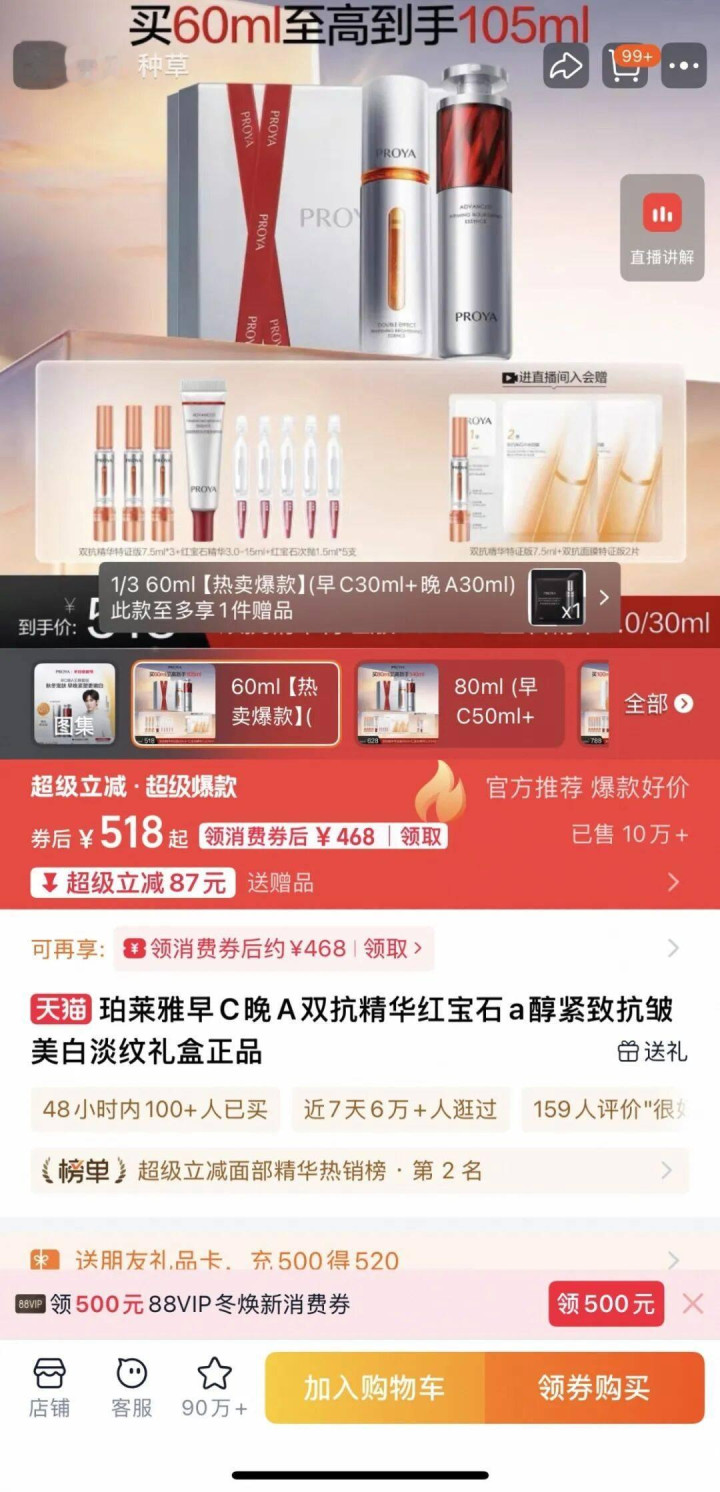 而从销量来看,倩碧302光子镭射销量3万+,只有珀莱雅早C晚A套装的三分之一。如果以单品来对比,珀莱雅双抗精华销量更是达到30万+,是倩碧的10倍。