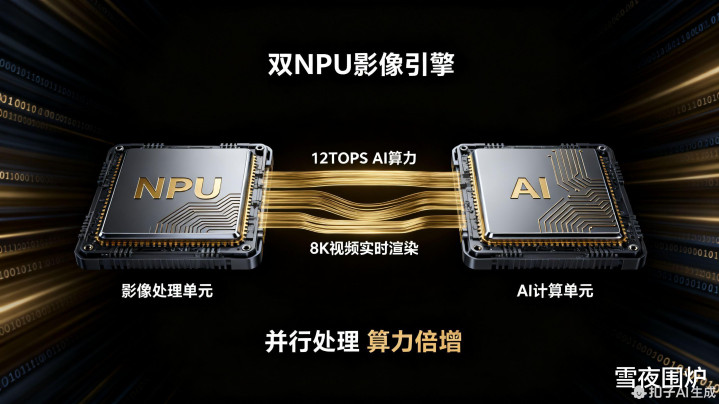 集成双NPU单元,每秒处理 31万亿次AI运算,支撑实时4K长焦视频背景虚化,功耗降低35%。